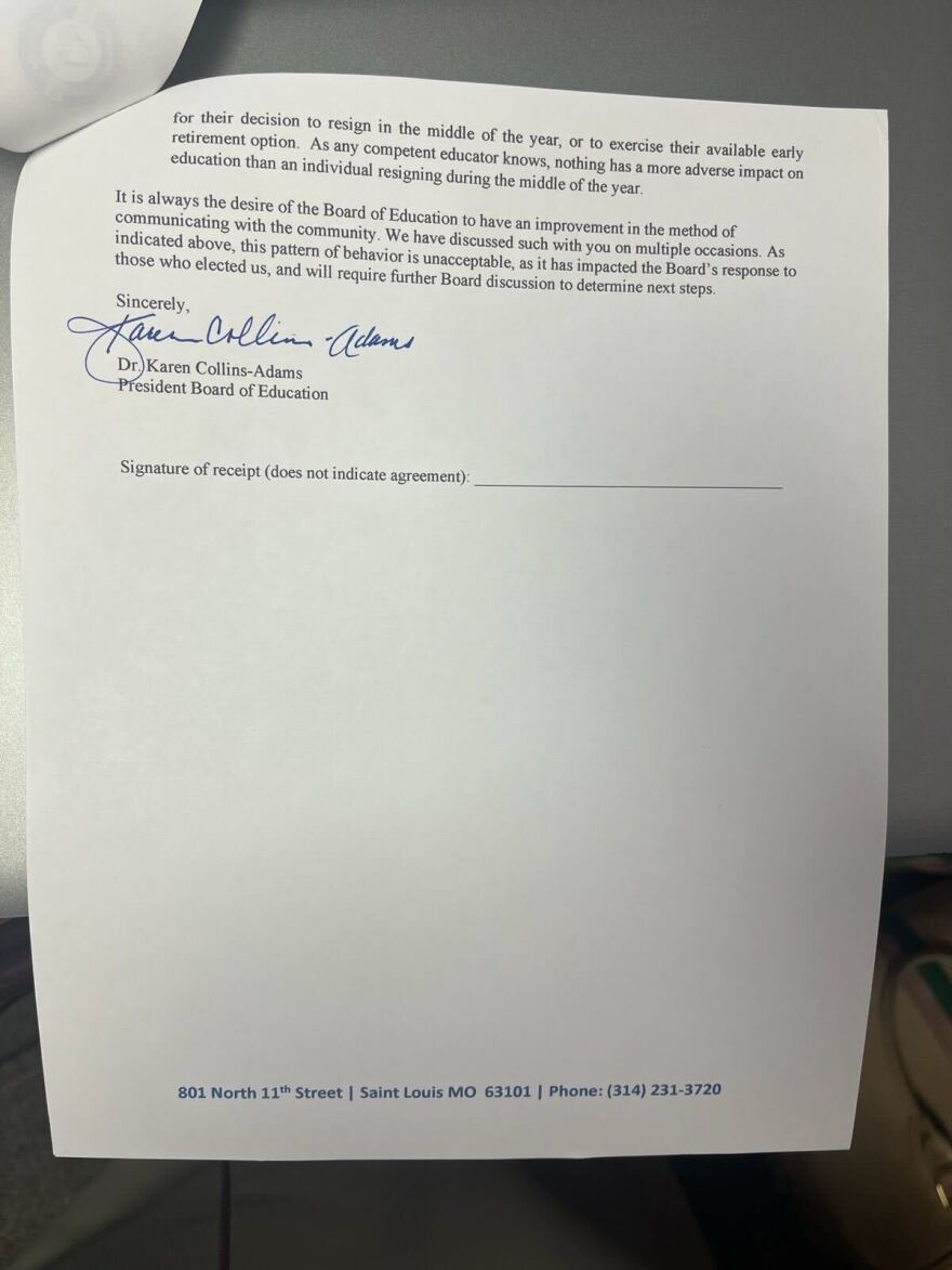 Former board member Ben Conover shared photos of a letter addressed to Borishade with St. Louis Public Radio. Collins-Adams and board Vice President Emily Hubbard confirmed the letter’s authenticity.